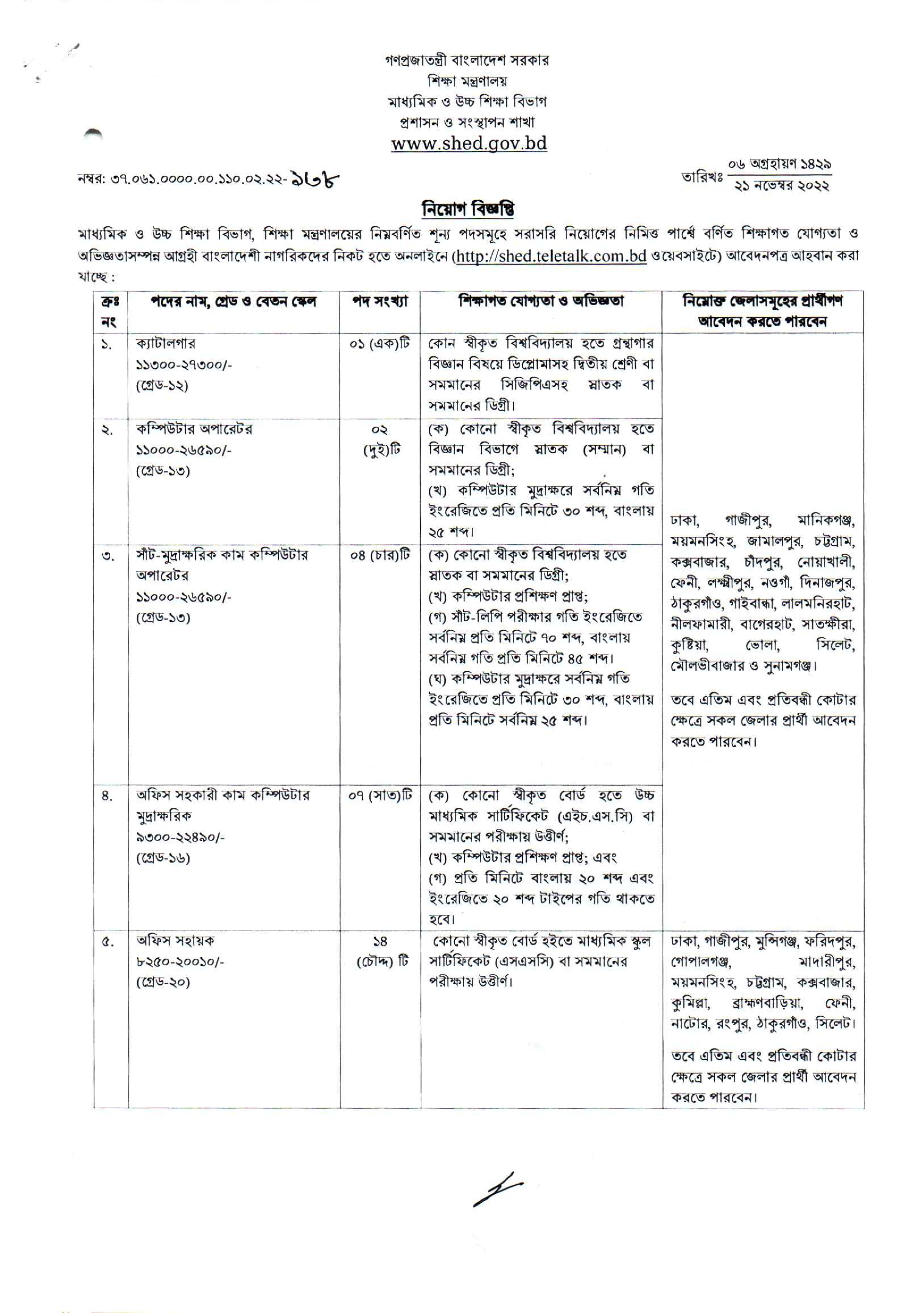 Secondary and Higher Education Division (SHED) Job Circular 2022: শিক্ষা মন্ত্রণালয়াধিন মাধ্যমিক ও উচ্চ মাধ্যমিক শিক্ষা বিভাগে নিয়োগ বিজ্ঞপ্তি ২০২২ অসিয়ালভাবে দৈনিক পত্রিকা ও অফিসিয়াল ওয়েবসাইটে প্রকাশিত হয়েছে। Secondary and Higher Education Division (SHED) Job Circular 2022 has been published on the official website www.shed.gov.bd উক্ত নিয়োগ বিজ্ঞপ্তি ০৫ টি পদের অধীনে মোট ২৮ জন লোক নিয়োগ করা হবে। বাংলাদেশের প্রকৃত নাগরিক নারী-পুরুষ উভয়েই আগামী ৩১ ডিসেম্বর ২০২২ তারিখ পর্যন্ত অনলাইনের মাধ্যমে আবেদন করতে পারবেন। চলুন Secondary and Higher Education Division (SHED) Niyog Biggopty 2022 -এর আলোকে আরোও বিস্তারিত জেনে নেই।